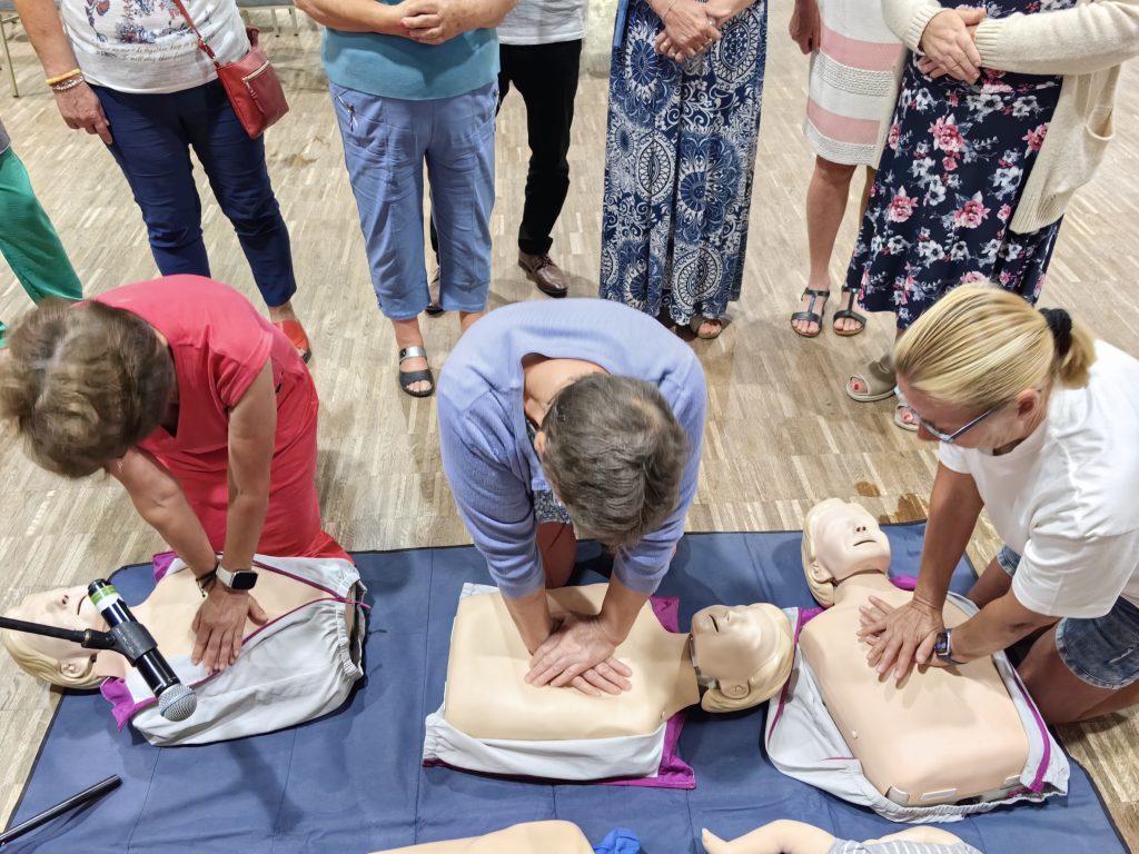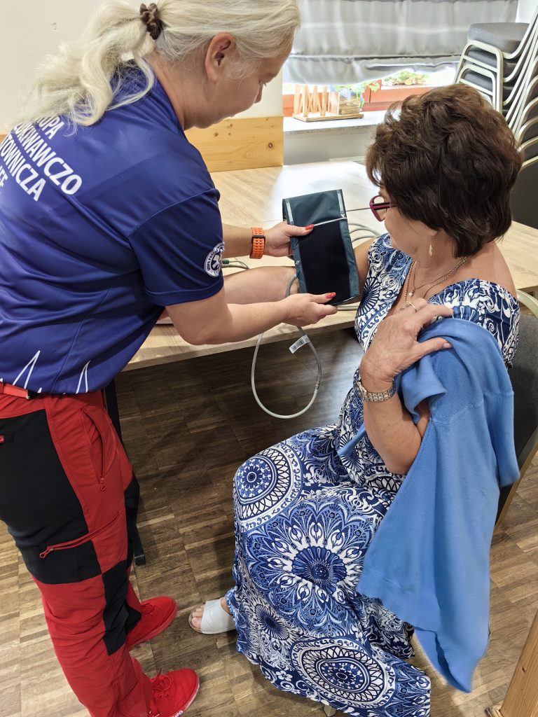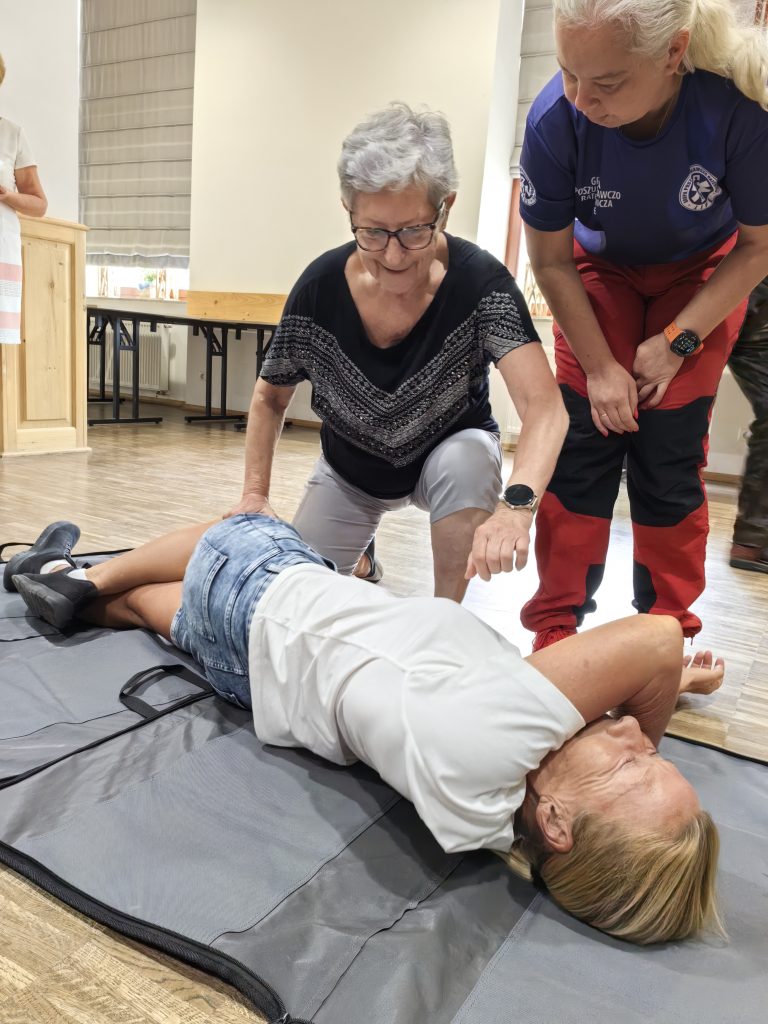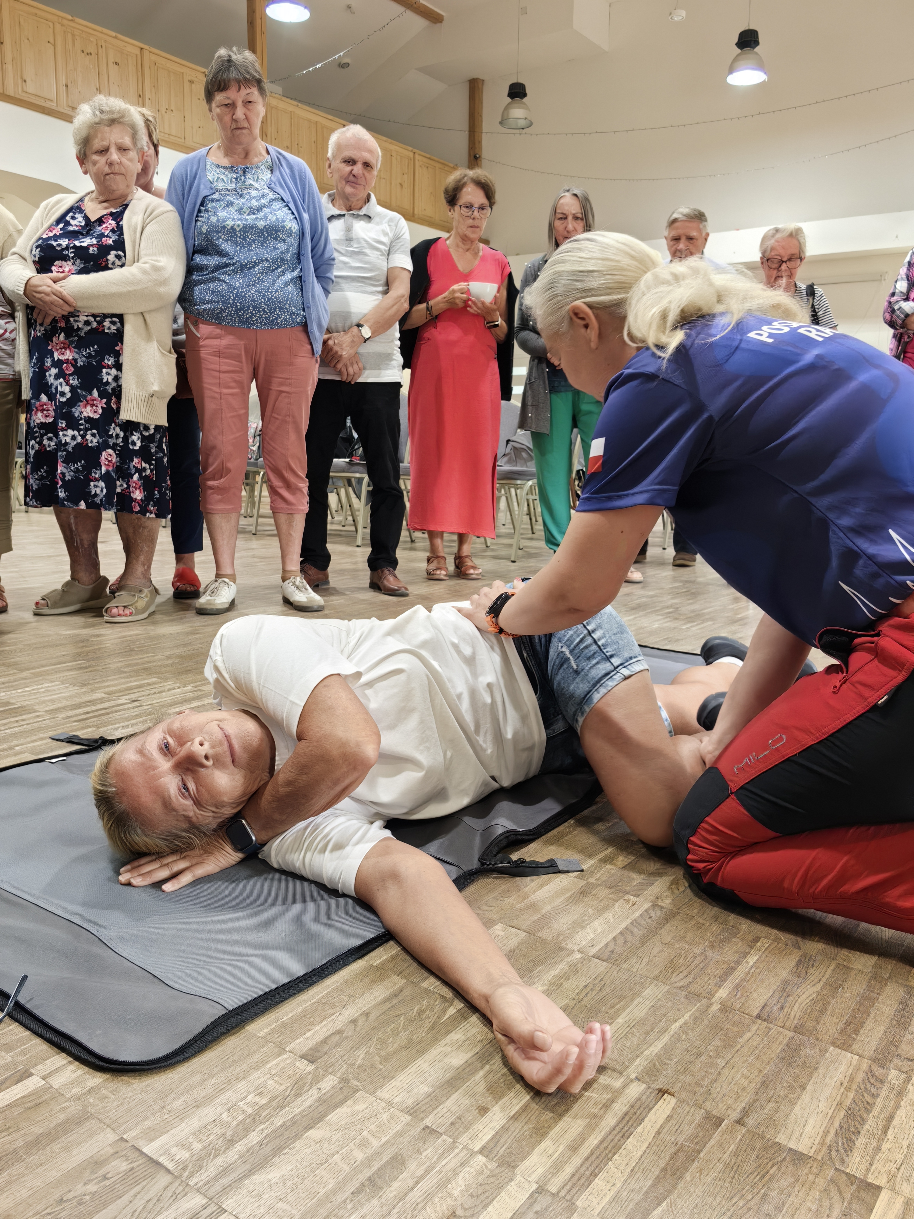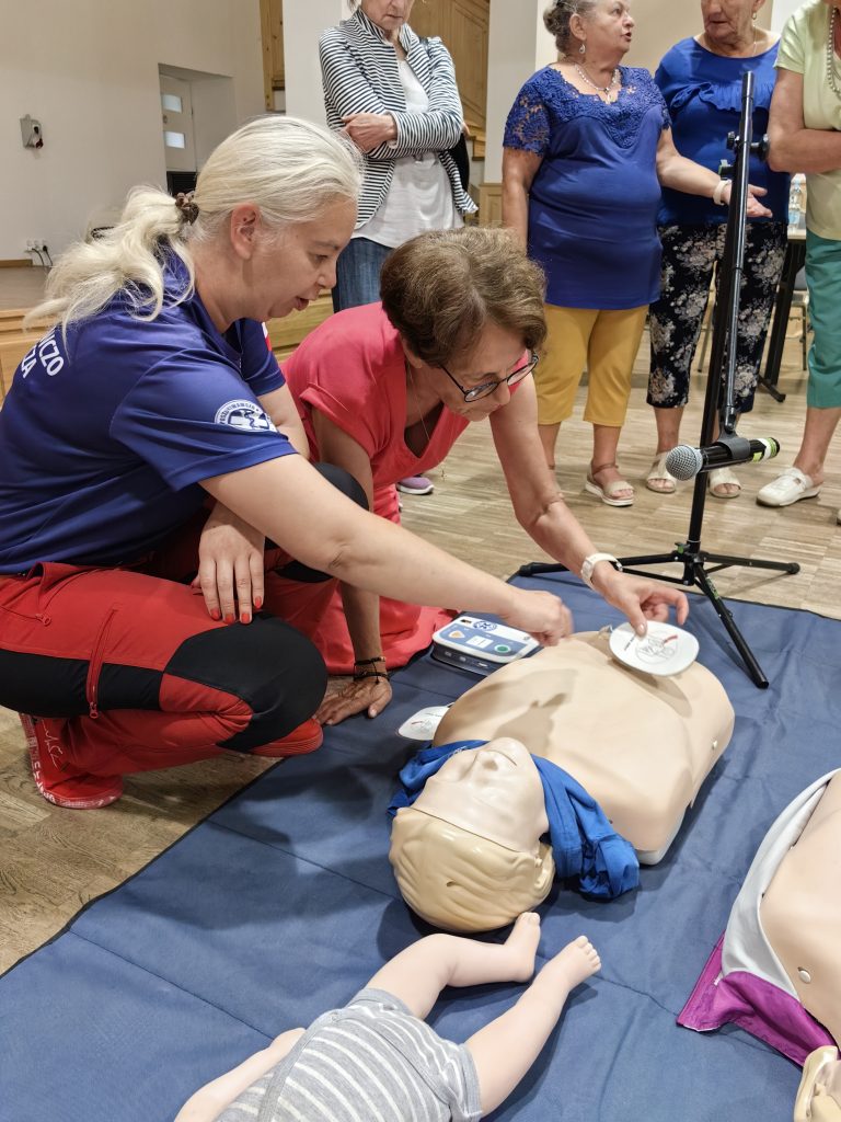 Ogromnym zainteresowaniem cieszyła się Strefa Zdrowia, gdzie seniorzy mogli w praktyczny sposób zdobyć wiedzę z zakresu pierwszej pomocy przedmedycznej. Instruktorzy zaprezentowali krok po kroku, jak prawidłowo ocenić stan poszkodowanego, wezwać pomoc oraz jak rozpocząć podstawowe czynności ratujące życie. Uczestnicy uczyli się m.in.: prowadzenia resuscytacji krążeniowo-oddechowej (RKO) na fantomie, obsługi automatycznego defibrylatora zewnętrznego (AED), bezpiecznego ułożenia osoby poszkodowanej w pozycji bocznej ustalonej.
