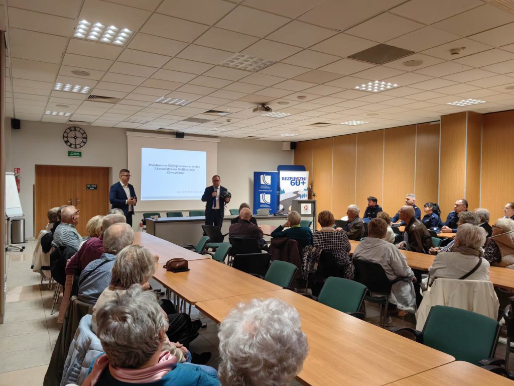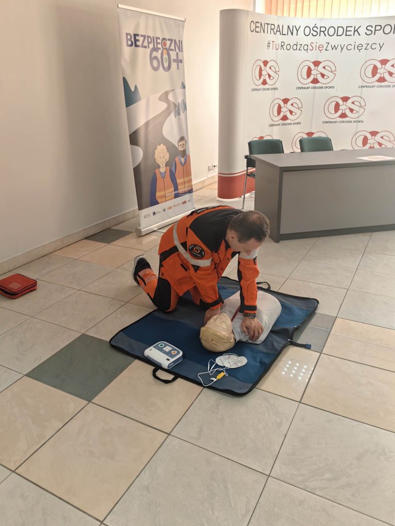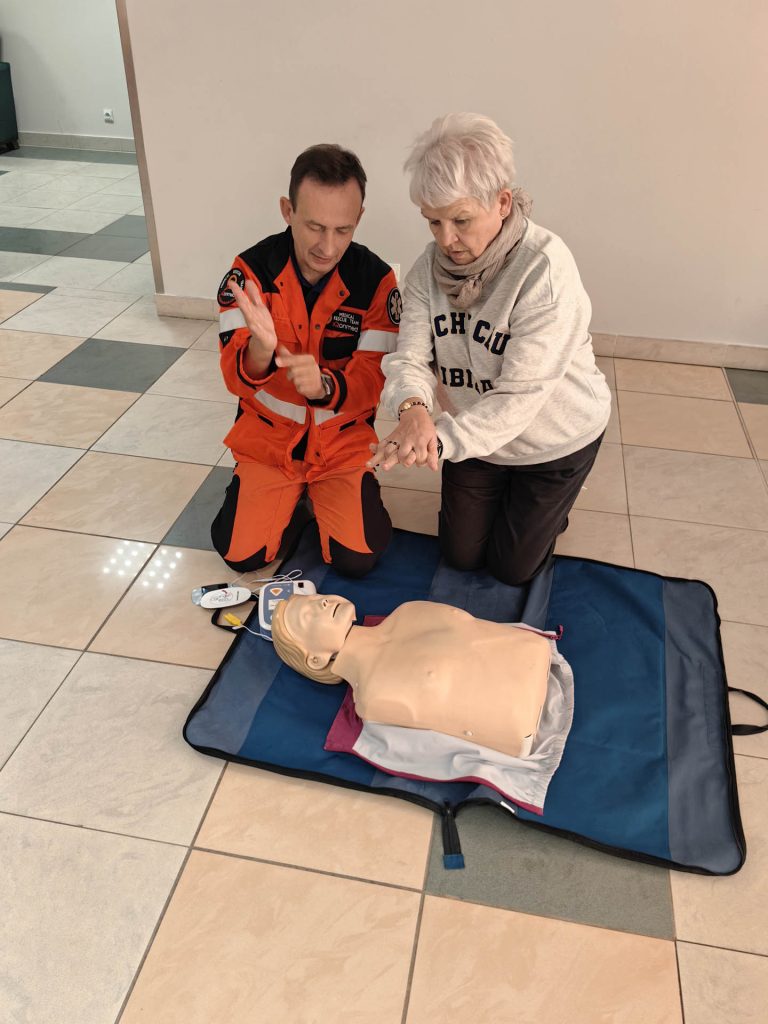 Istotnym punktem spotkania było szkolenie z zakresu pierwszej pomocy przedmedycznej. Uczestnicy najpierw zapoznali się z podstawowymi informacjami teoretycznymi podczas prezentacji, a następnie mieli możliwość przećwiczenia zdobytej wiedzy w praktyce – przy użyciu fantomu oraz defibrylatora AED.